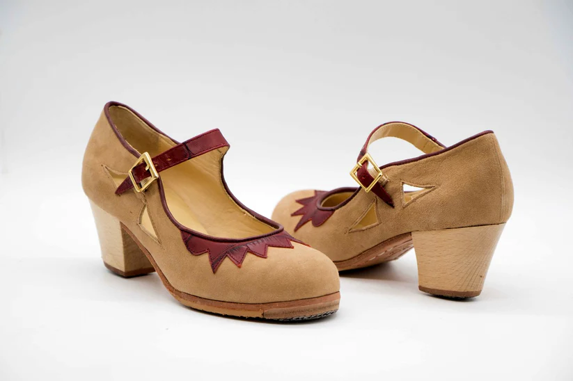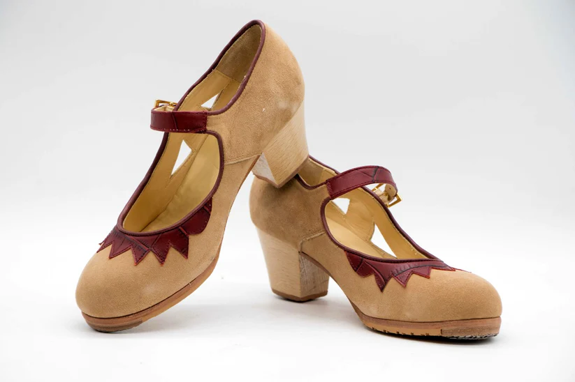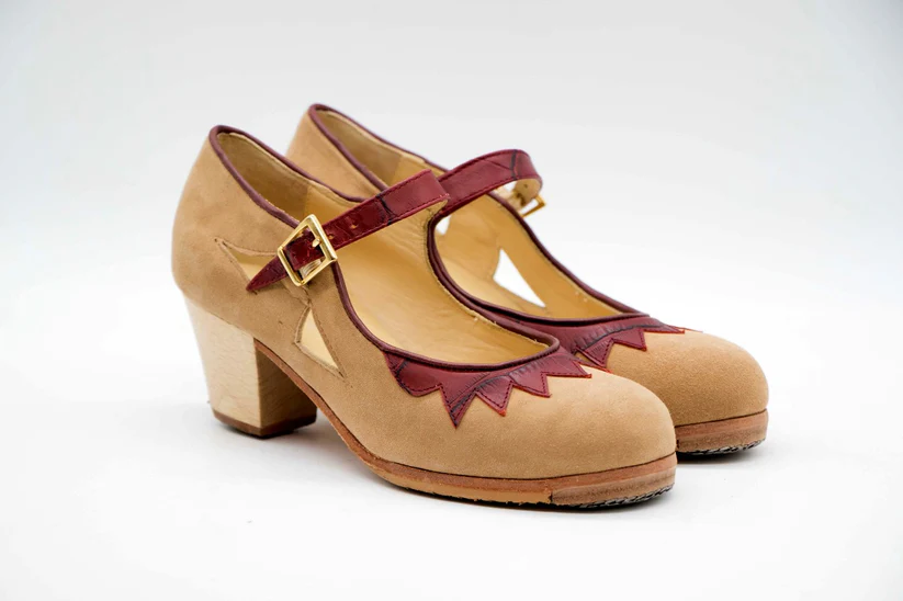 Zapatos de Flamenco profesional para mujer. Modelo Blanca. nº33AA. Doble Ancho. Únicos, hechos a mano por Antonio García. Fabricado en Ante Camel con detalle de Collarín y Correa en Coco Burdeos. Tacón Cubano Barnizado de 5,5 cm. Con clavos. Suela profesional cosida con filis de microfibra para amortiguar el golpe. Duración y sonido excepcional. Uno de los últimos zapatos fabricados por el artesano. Nuestra talla equivale a un número menos de los que calces en zapato de vestir (no deportiva). Por ejemplo si calzas un nº 37 en zapato. Nuestra talla será un nº 36.