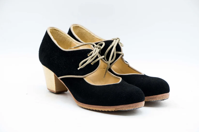 Zapatos de Flamenco profesional para mujer. Modelo Tientos. Nº33. Únicos, hechos a mano por Antonio García. Abierto Con cordones. Fabricado en Ante negro con ribete en piel beige. Tacón Cubano Barnizado de 5,5 cm. Con clavos. Suela profesional cosida con filis de microfibra para amortiguar el golpe. Duración y sonido excepcional. Uno de los últimos zapatos fabricados por el artesano. Nuestra talla equivale a un número menos de los que calces en zapato de vestir (no deportiva). Por ejemplo si calzas un nº 37 en zapato. Nuestra talla será un nº 36.