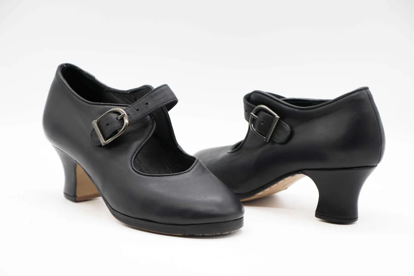 Zapatos de Flamenco profesional para mujer. Modelo Soleá, nº34AA. Doble Ancho. Únicos, hechos a mano por Antonio García. Cerrado con correa ancha. Fabricado en Piel Negro con . Tacón carrete forrado de 5,5 cm. de altura. Con clavos. Suela profesional cosida con filis de microfibra para amortiguar el golpe. Duración y sonido excepcional. Uno de los últimos zapatos fabricados por el artesano. Nuestra talla equivale a un número menos de los que calces en zapato de vestir (no deportiva). Por ejemplo si calzas un nº 37 en zapato. Nuestra talla será un nº 36.