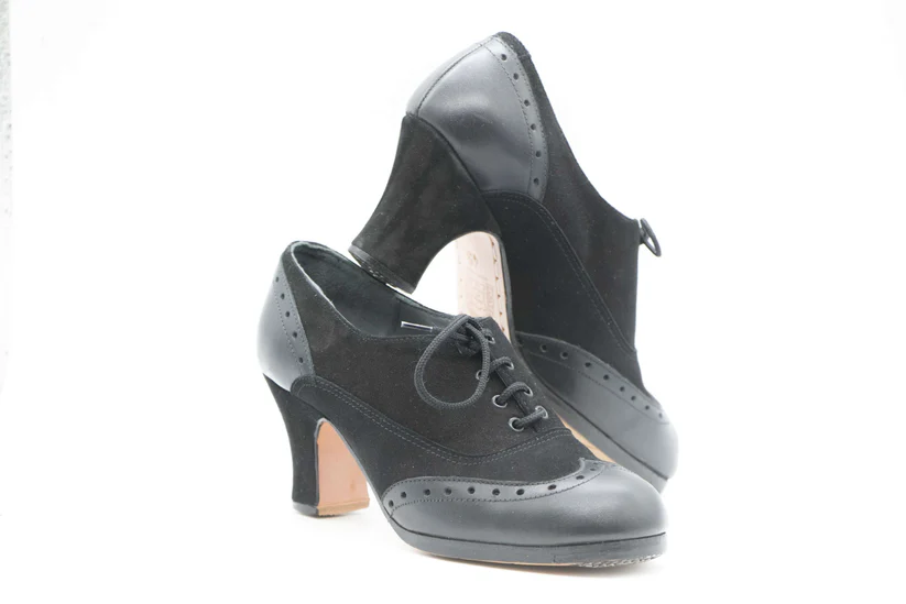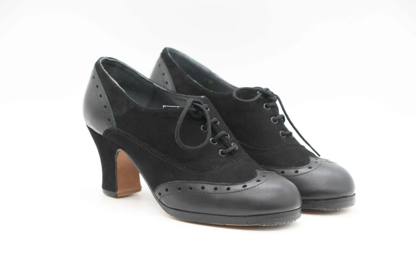 Zapatos de Flamenco profesional para mujer. Modelo Córdoba nº34,5. Únicos, hechos a mano por Antonio García. Abotinado Con cordones. Fabricado en Ante negro con puntera y trasera en piel negro. Tacón Semicarrete forrado en ante negro de 6,5 cm. Con clavos. Suela profesional cosida con filis de microfibra para amortiguar el golpe. Duración y sonido excepcional. Uno de los últimos zapatos fabricados por el artesano. Nuestra talla equivale a un número menos de los que calces en zapato de vestir (no deportiva). Por ejemplo si calzas un nº 37 en zapato. Nuestra talla será un nº 36.