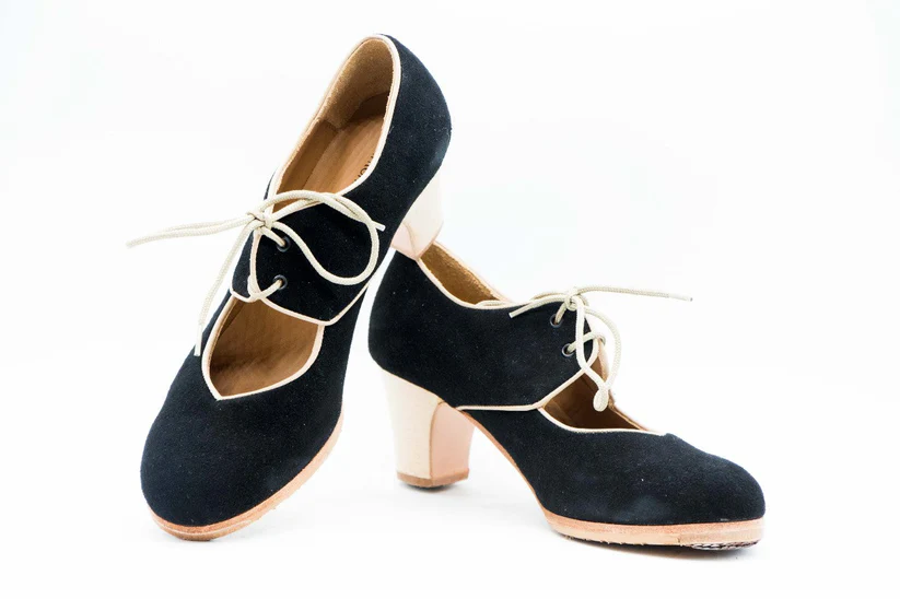 Zapatos de Flamenco profesional para mujer. Modelo Tientos. Nº34,5. Únicos, hechos a mano por Antonio García. Abierto Con cordones. Fabricado en Ante negro con ribete en piel beige. Tacón nº10 Barnizado de 5,5 cm. Con clavos. Suela profesional cosida con filis de microfibra para amortiguar el golpe. Duración y sonido excepcional. Uno de los últimos zapatos fabricados por el artesano. Nuestra talla equivale a un número menos de los que calces en zapato de vestir (no deportiva). Por ejemplo si calzas un nº 37 en zapato. Nuestra talla será un nº 36.