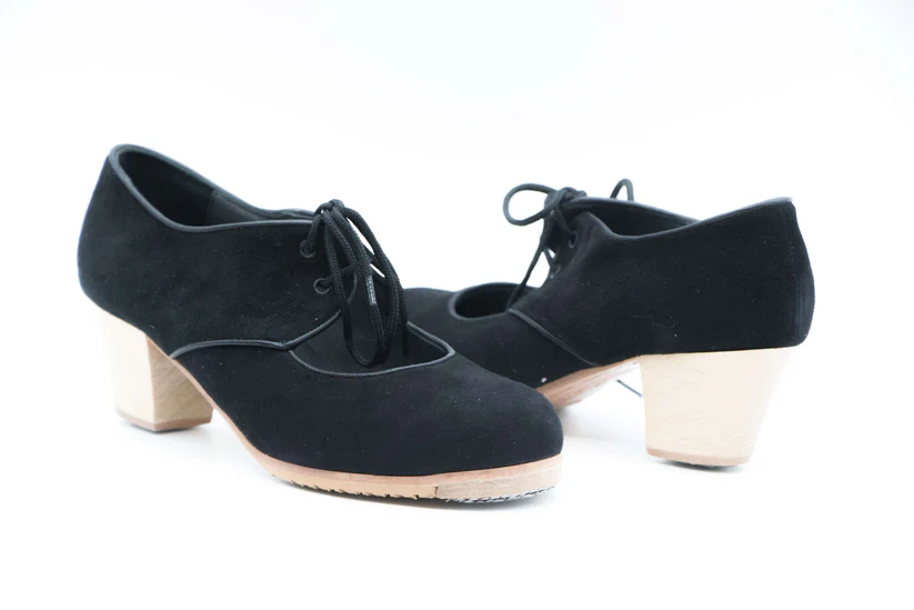Zapatos de Flamenco profesional para mujer. Modelo Tientos. Nº35AA. Doble Ancho. Abierto Con cordones. Fabricado en Ante negro con ribete en piel negro. Tacón cubano barnizado de 5,5 cm. Con clavos. Suela profesional cosida con filis de microfibra para amortiguar el golpe. Duración y sonido excepcional. Uno de los últimos zapatos fabricados por el artesano. Nuestra talla equivale a un número menos de los que calces en zapato de vestir (no deportiva). Por ejemplo si calzas un nº 37 en zapato. Nuestra talla será un nº 36.