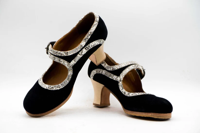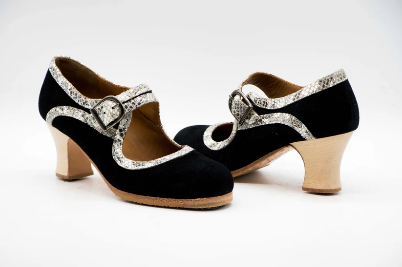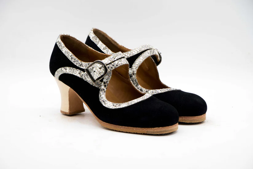Zapatos de Flamenco profesional para mujer. Modelo Caña. nº35,5. Únicos, hechos a mano por Antonio García. Con correa Ancha. Fabricado en ante negro con detalles en serpiente especial. Tacón semicarrete Barnizado de 6,5 cm. Con clavos. Suela profesional cosida con filis de microfibra para amortiguar el golpe. Duración y sonido excepcional. Uno de los últimos zapatos fabricados por el artesano. Nuestra talla equivale a un número menos de los que calces en zapato de vestir (no deportiva). Por ejemplo si calzas un nº 37 en zapato. Nuestra talla será un nº 36.