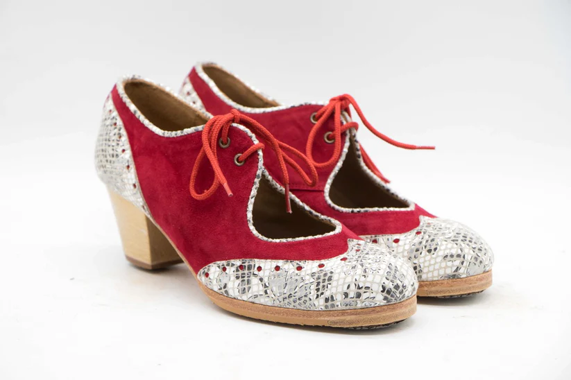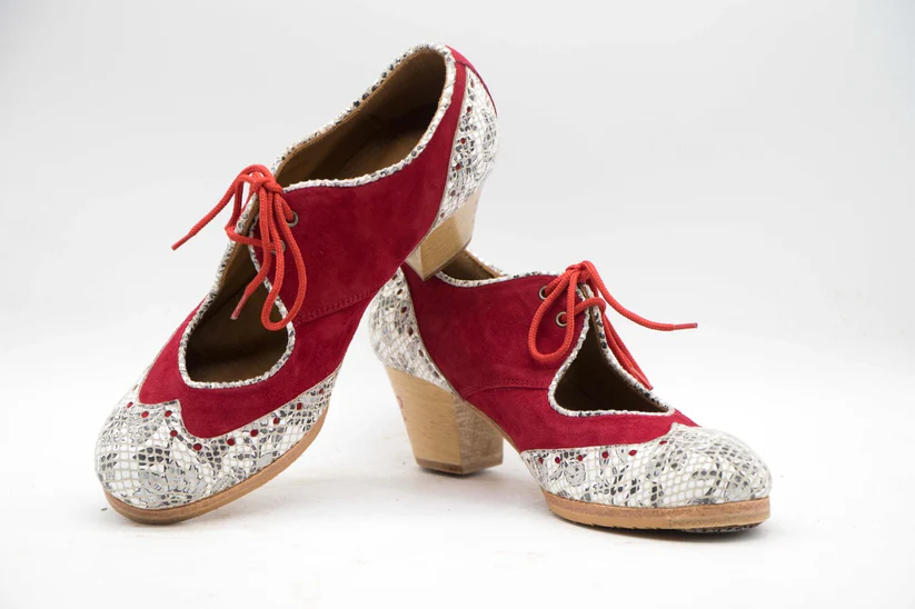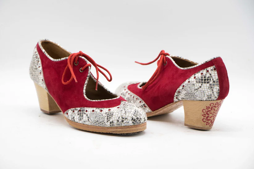 Zapatos de Flamenco profesional para mujer. Modelo Martinete. nº35,5. Únicos, hechos a mano por Antonio García. Con cordones. Fabricado en ante rojo con detalles en piel especial. Tacón Cubano con un Mandala rojo pintado a mano barnizado de 5,5 cm de altura. Con clavos. Suela profesional cosida con filis de microfibra para amortiguar el golpe. Duración y sonido excepcional. Uno de los últimos zapatos fabricados por el artesano. Nuestra talla equivale a un número menos de los que calces en zapato de vestir (no deportiva). Por ejemplo si calzas un nº 37 en zapato. Nuestra talla será un nº 36.