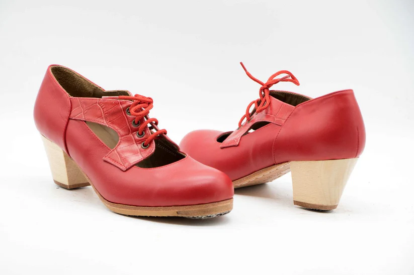 Zapatos de Flamenco profesional para mujer. Modelo Tronío, nº35. Únicos, hechos a mano por Antonio García. Con cordones. Fabricado en Piel rojo con cordonera en Coco rojo. Tacón Cubano Barnizado de 5,5 cm. Con clavos. Suela profesional cosida con filis de microfibra para amortiguar el golpe. Duración y sonido excepcional. Uno de los últimos zapatos fabricados por el artesano. Nuestra talla equivale a un número menos de los que calces en zapato de vestir (no deportiva). Por ejemplo si calzas un nº 37 en zapato. Nuestra talla será un nº 36.