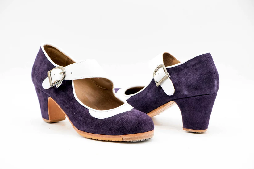 Zapatos de Flamenco profesional para mujer. Modelo Mirabrás. nº36. Únicos, hechos a mano por Antonio García. Con correa inclinada Ancha. Fabricado en ante morado con detalles en piel blanco. Tacón nº0 forrado en ante morado de 6,5 cm. Con clavos. Suela profesional cosida con filis de microfibra para amortiguar el golpe. Duración y sonido excepcional. Uno de los últimos zapatos fabricados por el artesano. Nuestra talla equivale a un número menos de los que calces en zapato de vestir (no deportiva). Por ejemplo si calzas un nº 37 en zapato. Nuestra talla será un nº 36. Consulta la equivalencia de tallas en las imágenes.