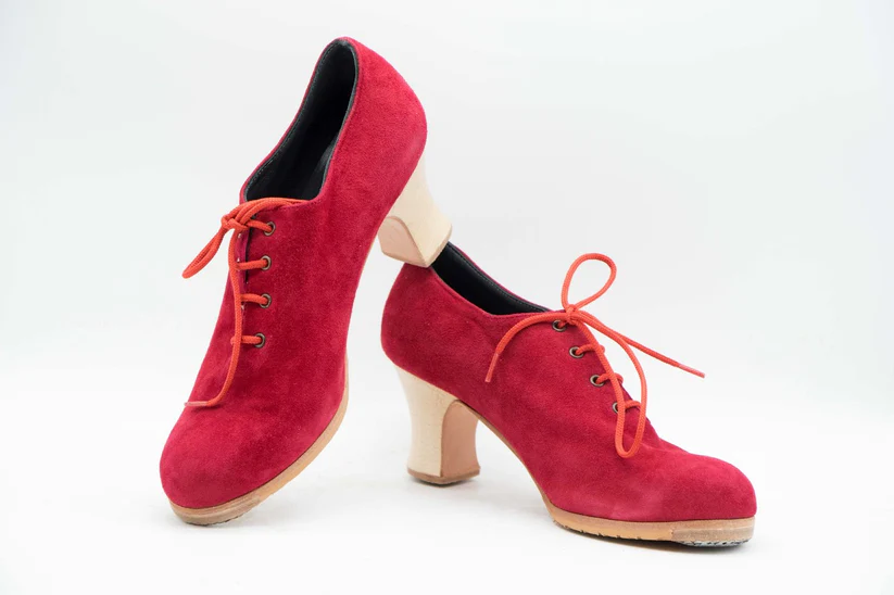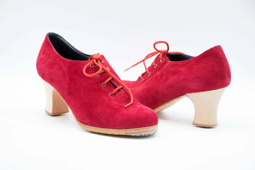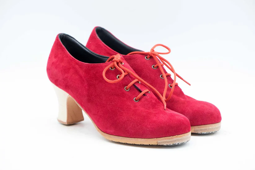 Zapatos de Flamenco profesional para mujer. Modelo Rumbera. nº36. Únicos, hechos a mano por Antonio García. Cerrado con cordones. Fabricado en ante rojo. Tacón Semicarrete Barnizado de 6,5 cm. Con clavos. Suela profesional cosida con filis de microfibra para amortiguar el golpe. Duración y sonido excepcional. Uno de los últimos zapatos fabricados por el artesano. Nuestra talla equivale a un número menos de los que calces en zapato de vestir (no deportiva). Por ejemplo si calzas un nº 37 en zapato. Nuestra talla será un nº 36.