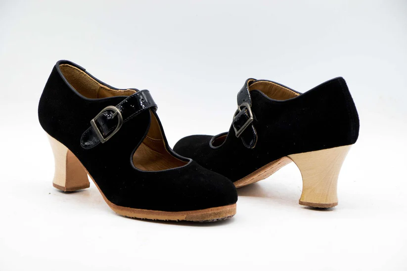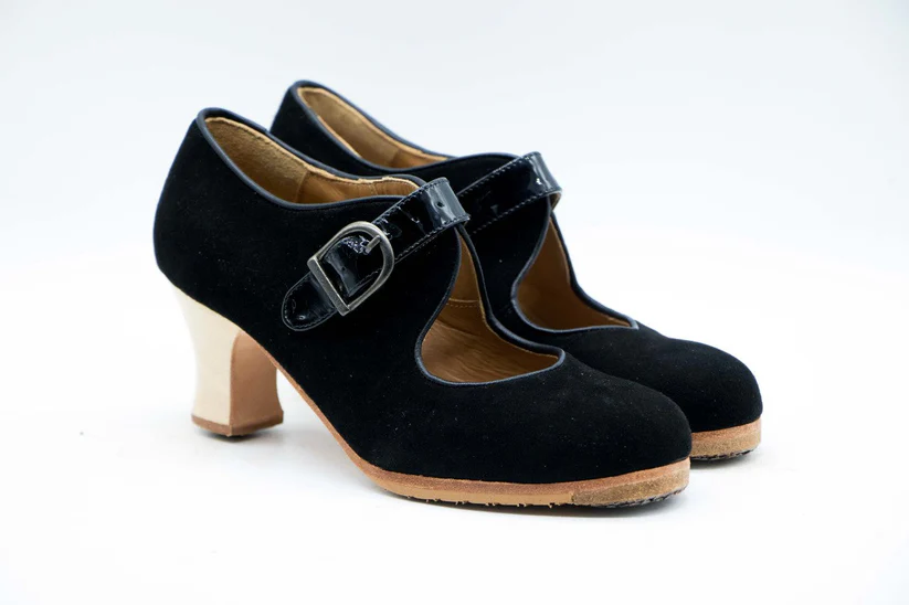 Zapatos de Flamenco profesional para mujer. Modelo Soleá, nº36,5. Únicos, hechos a mano por Antonio García. Cerrado con correa ancha. Fabricado en Ante Negro con detalles en charol negro. Tacón Semicarrete barnizado de 6,5 cm. de altura. Con clavos. Suela profesional cosida con filis de microfibra para amortiguar el golpe. Duración y sonido excepcional. Uno de los últimos zapatos fabricados por el artesano. Nuestra talla equivale a un número menos de los que calces en zapato de vestir (no deportiva). Por ejemplo si calzas un nº 37 en zapato. Nuestra talla será un nº 36.