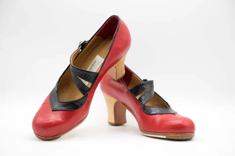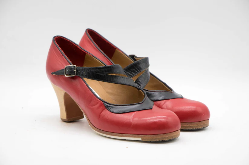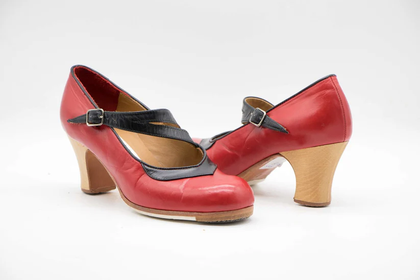 Zapatos de Flamenco profesional para mujer. Modelo Cantiñas nº37. Únicos, hechos a mano por Antonio García. Fabricado en piel rojo con detalles en piel negro. Tacón Semicarrete barnizado de 6,5 cm. Con clavos. Suela profesional cosida con filis de microfibra para amortiguar el golpe. Duración y sonido excepcional. Uno de los últimos zapatos fabricados por el artesano. Nuestra talla equivale a un número menos de los que calces en zapato de vestir (no deportiva). Por ejemplo si calzas un nº 37 en zapato. Nuestra talla será un nº 36.