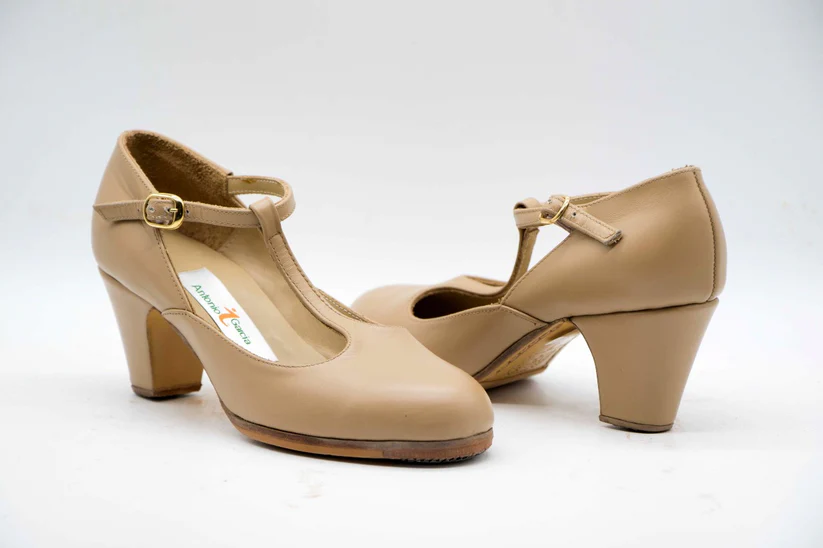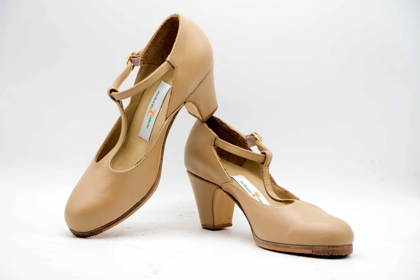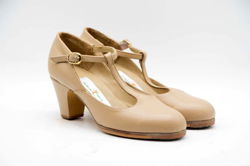 Zapatos de Flamenco profesional para mujer. Modelo Danza nº37. Únicos, hechos a mano por Antonio García. Con correa al centro. Fabricado en piel beige. Tacón nº0 forrado de 6,5 cm. Con clavos. Suela profesional cosida con filis de microfibra para amortiguar el golpe. Duración y sonido excepcional. Uno de los últimos zapatos fabricados por el artesano. Nuestra talla equivale a un número menos de los que calces en zapato de vestir (no deportiva). Por ejemplo si calzas un nº 37 en zapato. Nuestra talla será un nº 36.