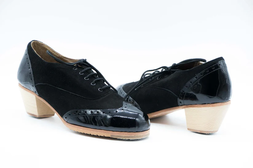 Zapatos de Flamenco profesional para Hombre. Modelo Cordobés. nº37. Únicos, hechos a mano por Antonio García. Zapato con cordones. Fabricado en Ante Negro con detalles en charol negro. Tacón boto barnizado de 5 cm. Con clavos. Suela profesional cosida con filis de microfibra para amortiguar el golpe. Duración y sonido excepcional. Uno de los últimos zapatos fabricados por el artesano. Otros países consultar. Nuestra talla equivale a un número menos de los que calces en zapato de vestir (no deportiva). Por ejemplo si calzas un nº 40 en zapato. Nuestra talla será un nº 39.
