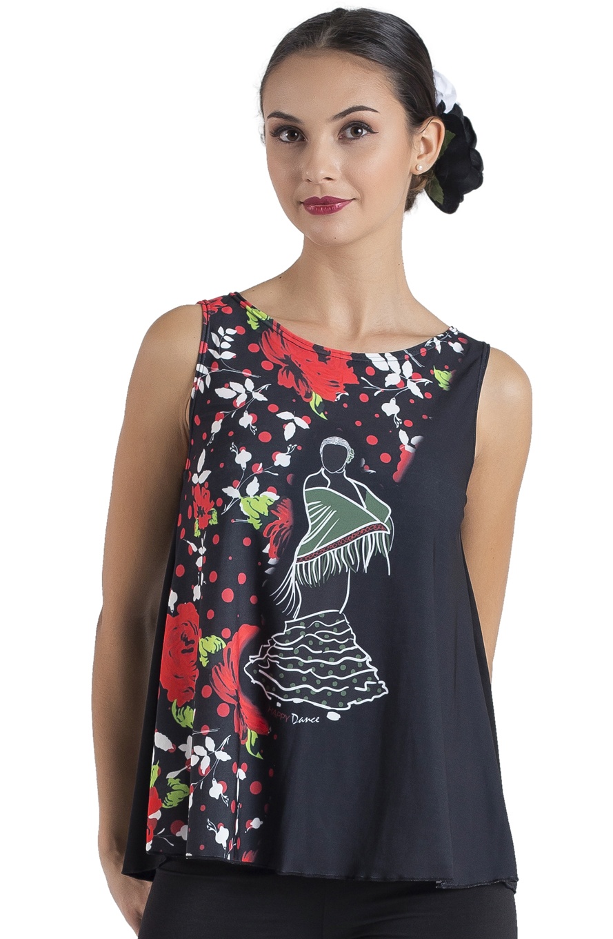 Camiseta Flamenco Bailadora y Flores Sin Mangas