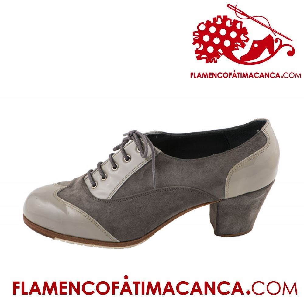 Zapato de flamenco de diseño abotinado que cubre totalmente el pie, similar al Carácter para caballeros y con piezas que se combinan en distinto material y color.