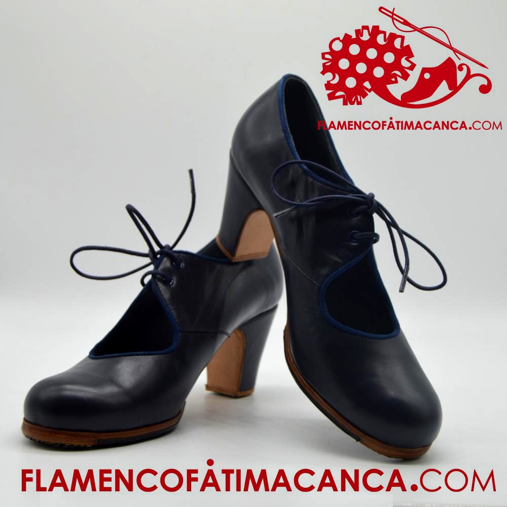 Zapato para baile flamenco echo a mano fabricado en España. Calzado flamenco de línea clásica y abotinada la cual se sujeta con cordones. Pieles y forros de 1º calidad. Suela doble de cuero cosida. Doble cantidad de clavos en puntera y tacón puesto uno a uno con pulido final. Refuerzos en puntera y talón. Filis antideslizantes. Fabricado artesanalmente por profesional del calzado.