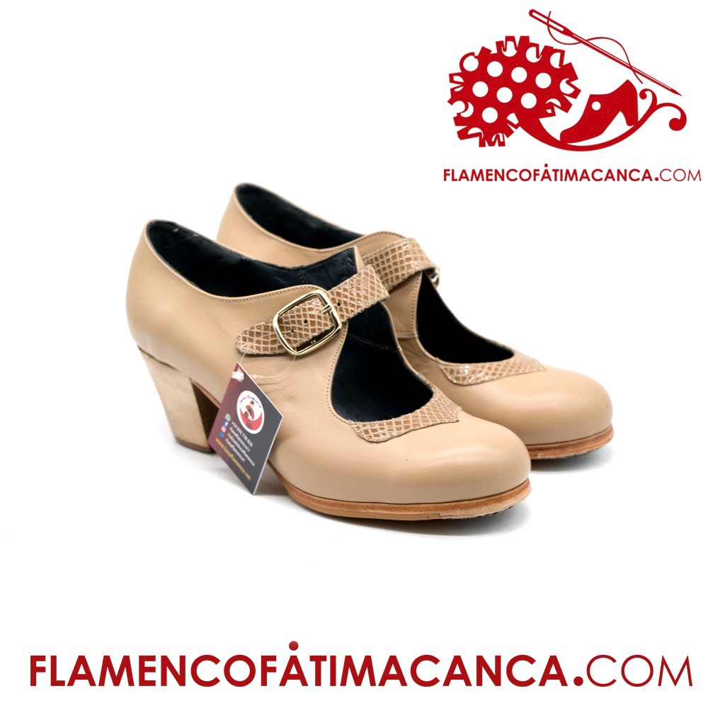 Calzado flamenco de línea nueva abotinado dividido en una pieza frontal y otra trasera con atadura de cordones. Pieles y forros de 1º calidad. Suela doble de cuero cosida. Doble cantidad de clavos en puntera y tacón puesto uno a uno con pulido final. Refuerzos en puntera y talón. Filis antideslizantes. Fabricado artesanalmente por profesional del calzado.