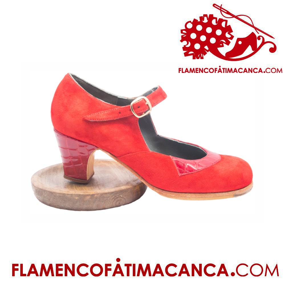Calzado flamenco de línea nueva con adorno en la pala del zapato y corte en V, que se abrocha con correa.