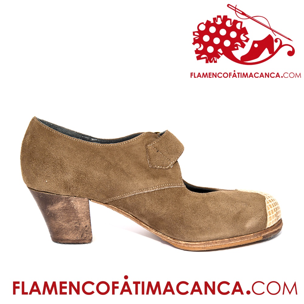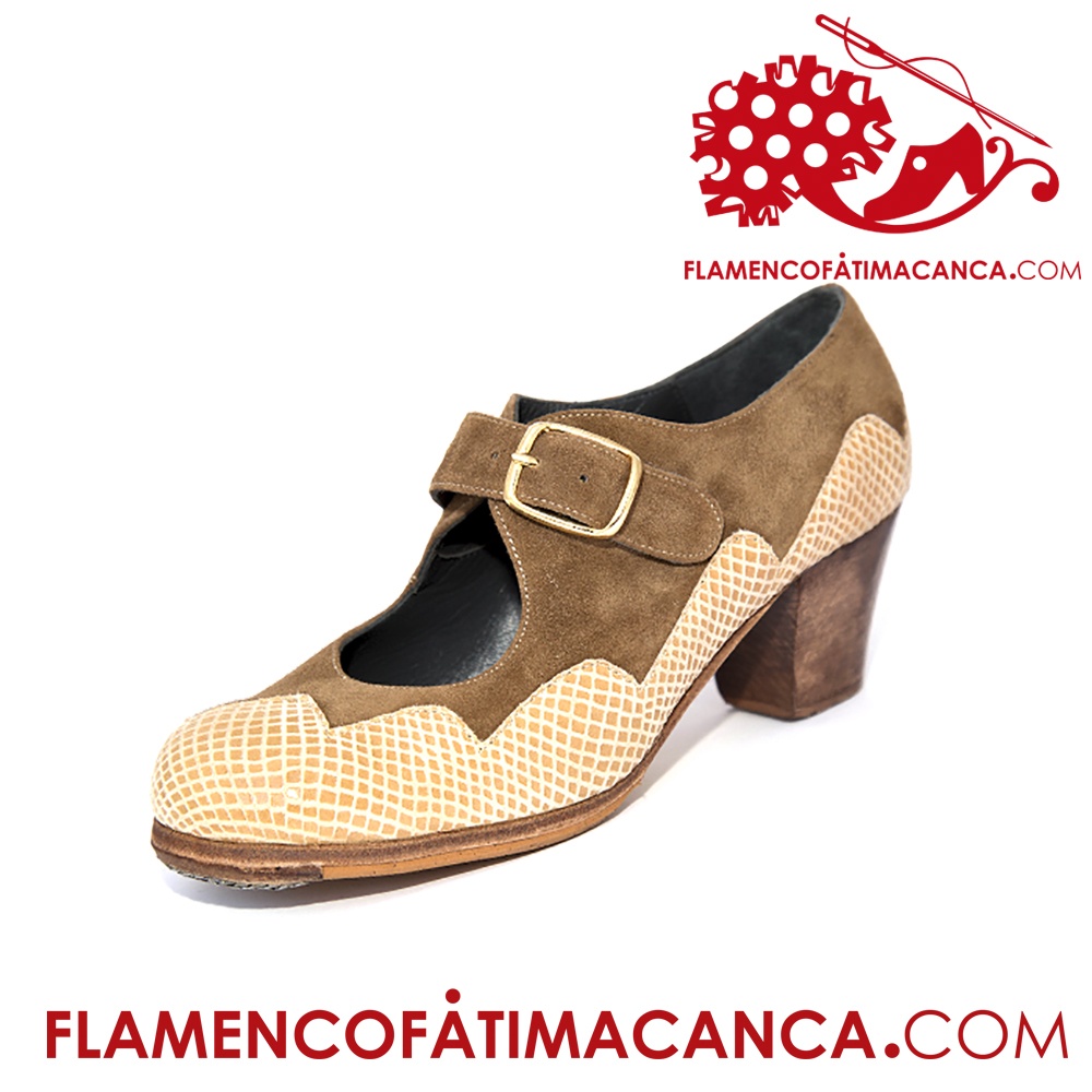 Calzado flamenco de línea nueva con adorno al lateral del calzado en forma de ondas y atadura con correa ancha y hebilla grande. Pieles y forros de 1º calidad. Suela doble de cuero cosida. Doble cantidad de clavos en puntera y tacón puesto uno a uno con pulido final. Refuerzos en puntera y talón. Filis antideslizantes. Fabricado artesanalmente por profesional del calzado.
