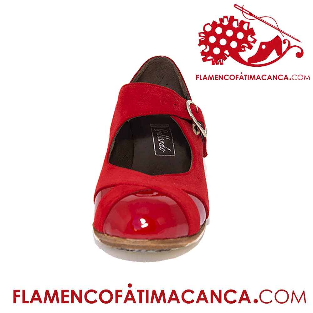 Variante del modelo base Yerbabuena A, zapato de flamenco de línea abotinado sujeto con cordones en el empeine pero con adorno de calado a ambos lados y con posibilidad de combinar distintos materiales. Fabricado en piel bovina de primera calidad, lleva filis antideslizantes y numerosos clavos en punta y tacón. Admite gran variedad de colores y tacones.